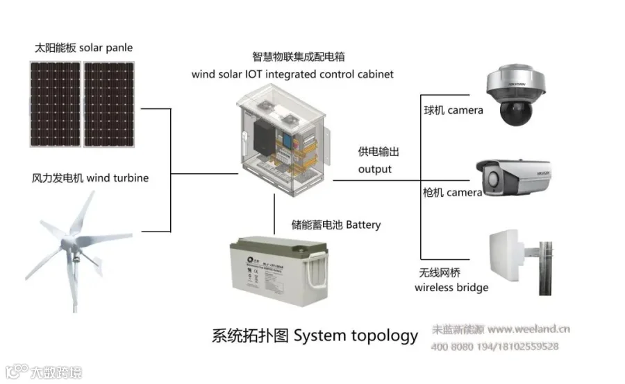 太阳能发电是整个系统工作能量的主要来源,太阳能组件的大小需要根据负载设备的耗电量来决定。风力发电平时起辅助供电的作用,在连续阴雨天的时候,风力发电机将发挥重要作用,以确保对控制器的不间断供电,从而避免了长时间阴雨天气下供电系统的瘫痪。
