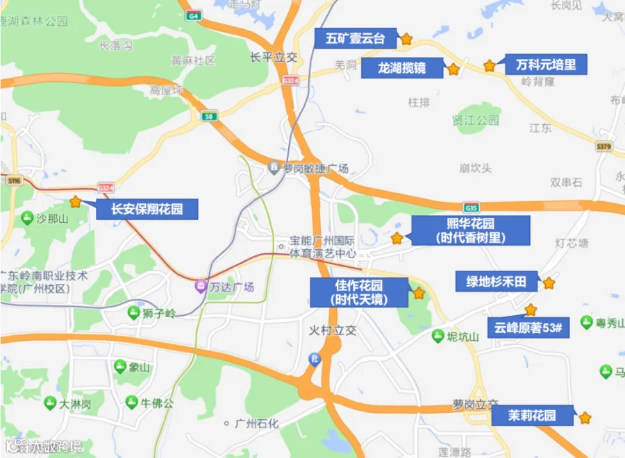 · 高快速路密集:毗邻花莞高速知识城出口,连通广河高速、华南快速干线、从埔高速、增天高速(建设中)等。