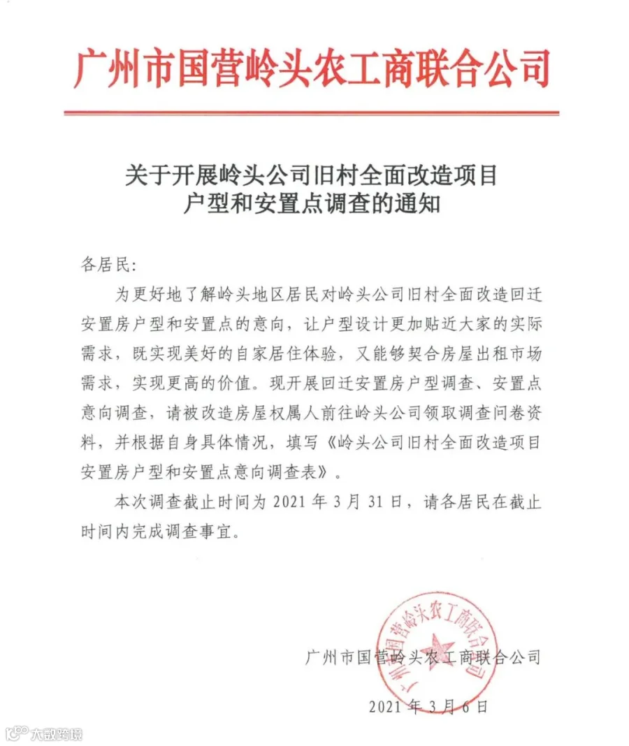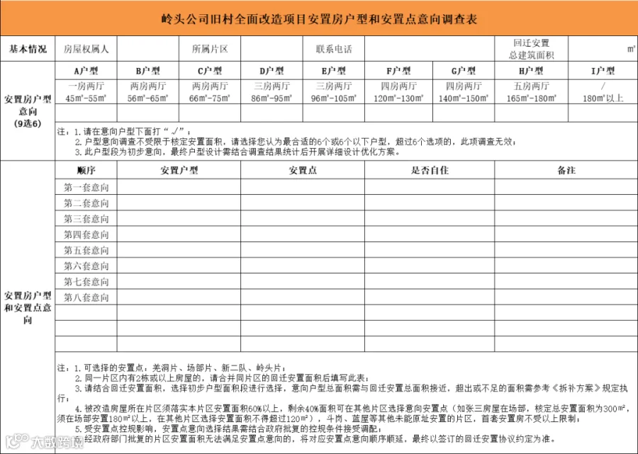 为更好地了解岭头地区居民对岭头公司旧村全面改造回迁安置房户型和安置点的意向,让户型设计更加贴近大家的实际需求,既实现美好的自家居住体验,又能够契合房屋出租市场需求,实现更高的价值。现开展回迁安置房户型调查、安置点意向调查,请被改造房屋权属人前往岭头公司领取调查问卷资料,并根据自身具体情况,填写《岭头公司旧村全面改造项目安置房户型和安置点意向调查表》。