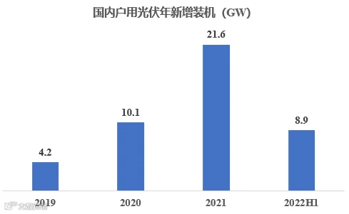 2019、2020、2021年,我国户用光伏新增装机快速增长,几乎一年翻一番;到2021年达到21.6GW,成为最重要的光伏类型之一。2022年上半年,国内新增户用光伏装机规模达到8.9GW,在总装机中占比29%!