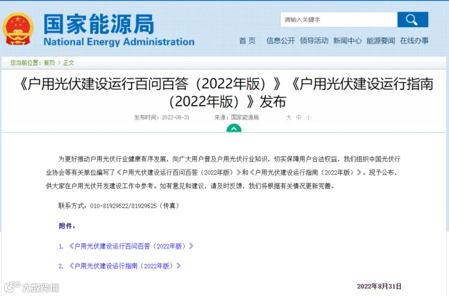 在此基础上,2022年8月31日,国家能源局发布了《户用光伏建设运行百问百答(2022年版)》《户用光伏建设运行指南(2022年版)》。
