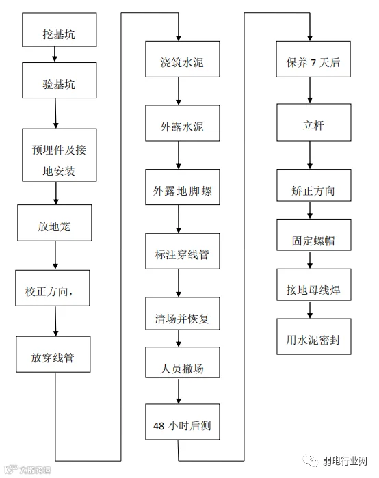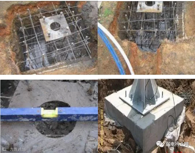监控基础浇筑步骤:安放地笼、安装接地、预埋管线(光路、电路管线)、浇筑混凝土(商混 C25)、使用震动棒排出混凝土中的空气、打水平仪调整角度、安装模具(制作各个尺寸)保养、悬挂警示标志。