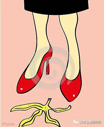 一打印机旁落有一张刚打印好的纸张,纸上刚好是一张香蕉皮图案。这时,一位优雅的女士匆匆的走了进来,当走到该纸张的面前时,急速“刹车”,并叫了声:啊,香蕉皮,差点就踩到了!