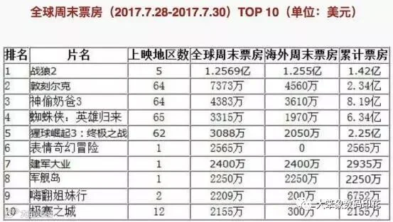 不仅稳拿国内目前上映影片票房第一,《战狼2》在上周末领跑全球票房榜,第一周末报收1.25亿美元,甚至击败了好莱坞著名导演克里斯托弗·诺兰的《敦刻尔克》。