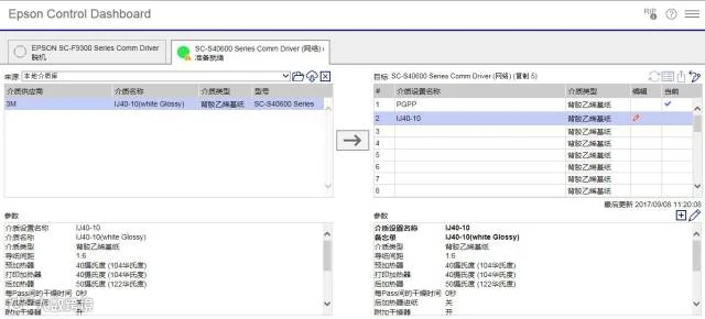 用户通过Epson Control Dashboard软件,从服务器上下载EMX文件,该文件预置包括ICC曲线、硬件介质参数。预设文件的好处就是极大简化用户的操作流程。要知道在打印机硬件操作上,针对不同的介质,要进行多种参数的优化设置,主要包括打印头间距、打印前中后三阶段的加热器温度、介质张力、搓纸轮压力、平台吸力、后纸纠偏以及定期清洗时间等,设置虽然不难,但毕竟需要一点点的时间和经验。而大家用的打印机型号和介质不同,在各种交流平台上也很难找到匹配的参考数值,这种感觉就像买了没料包的泡面一样不知所措。
