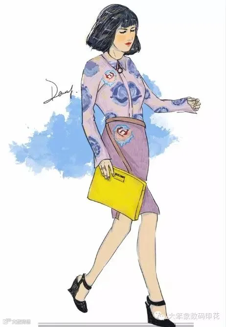 优雅紫色套装,浅紫色上衣和裙子的绣片相互呼应,紫色短裙是毛毡质感,加上不对称设计和立体绣片,加入一抹明亮的黄色手拿包,冬天外出再加上一件羊绒大衣就完美了