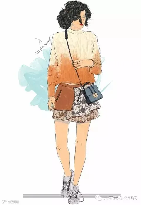 渐变毛衣搭配素色印花短裙,皮质造型结合硬层印花网纱与毛衣同色系,估蓝色中带有紫色的包平衡橘色调搭配球鞋更有个性