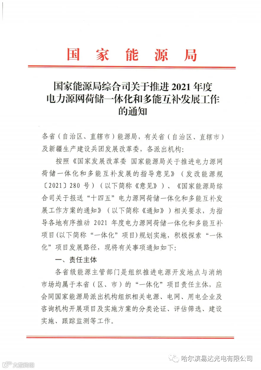 11月10日,国家能源局综合司《关于推进2021年度电力源网荷储一体化和多能互补发展工作的通知》,文件提出: