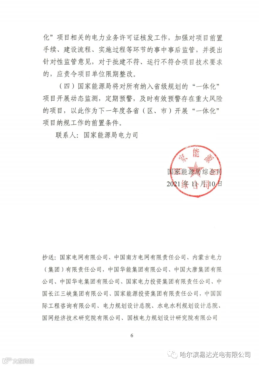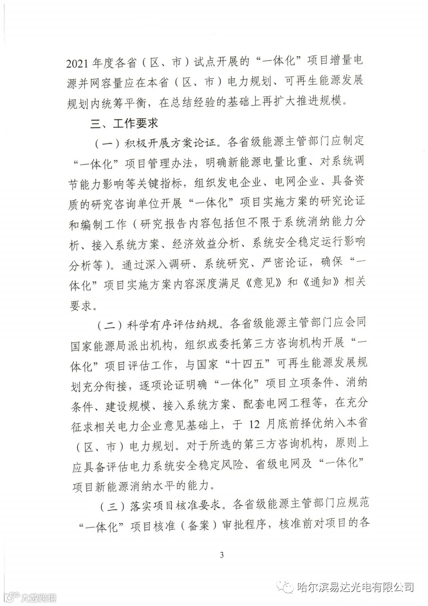 各省级能源主管部门应开展“一体化”项目评估工作,与国家“十四五”可再生能源发展规划充分衔接,逐项论证明确“一体化”项目立项条件、消纳 条件、建设规模、接入系统方案、配套电网工程等,在充分 征求相关电力企业意见基础上,于 12 月底前择优纳入本省(区、市)电力规划。