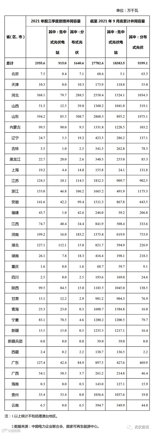 今日了解到,国家能源局网站发布《2021年前三季度全国光伏发电建设运行情况》,国家能源局发布2021年前三季度全国光伏发电建设运行情况,前三季度新增并网容量2555.6万千瓦,截至2021年9月底累计并网容量27782.6万千瓦。