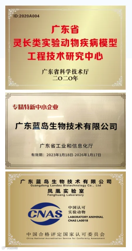 蓝岛生物成立于1980年,是国内最早从事非人灵长类实验动物繁育及研究的专业机构之一,也是国内领先的人类复杂疾病实验猴模型研发制作中心,先后被评为:“广东省灵长类实验动物疾病模型工程技术研究中心” “广东省灵长类实验动物重点科研基地” “高新技术企业” “瞪羚企业” “专精特新企业”等等。