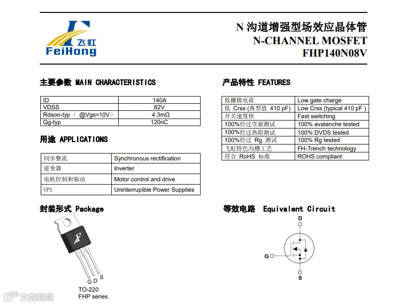 它就是具备82V、140A的电压、电流的FHP140N08V 场效应管,是飞虹半导体研发常用于ups不间断电源中的一款场效应管,能无缝代换IRFB3607PBF场效应管。