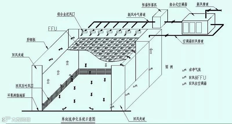 乱流式:空气由空调箱经风管与洁净室内之空气过滤器(HEPA)进入洁净室,并由洁净室两侧隔间墙板或高架地板回风。气流非直线型运动而呈不规则之乱流或涡流状态。此型式适用于洁净室等级1,000-100,000级。