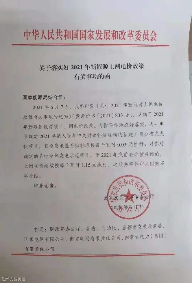 红头文件:《关于落实好2021年新能源上网电价政策有关事项的函》