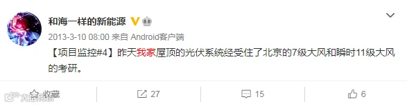 2013年,装机第二年,他在微博分享自家光伏电站的情况:经受住7级和11级大风。拥有产品质量保障的光伏电站,不会轻易被恶劣的环境打击。