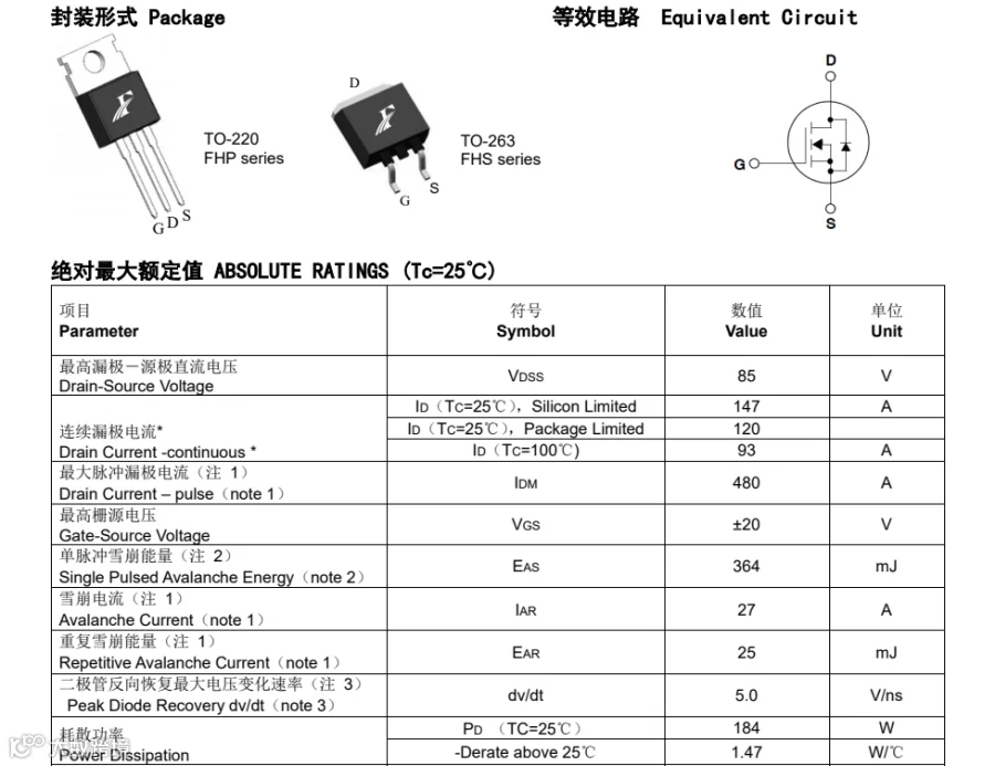 FHP110N8F5B的主要封装形式是TO-263、TO-220。这款产品参数:Vgs(±V):20;VTH(V):2-4;ID(A):147A;BVdss(V):85V。