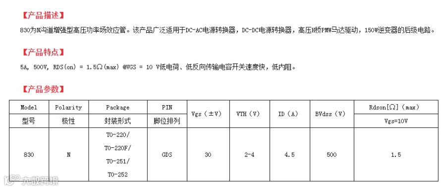目前这款FHP830为N沟道增强型高压功率MOS场效应管,它在使用方面不仅能匹配型号为5N50的国外场效应管,还能代用9N50、IRF840型号的场效应管。目前广泛使用的场景是150W逆变器后级电路、DC-AC电源转换器、DC-DC电源转换器、高压H桥PWM马达驱动四款产品中。