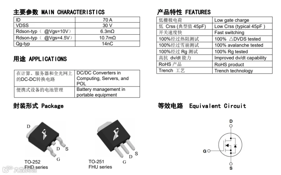FHD70N03C为N沟道增强型场效应晶体管,采用先进的trench工艺来获得优秀的FOM(RDSon*Qg),可广泛使用在计算、服务器和全光网上的DC-DC转换电路、在锂电池保护板、便携式设备的电池管理上。
