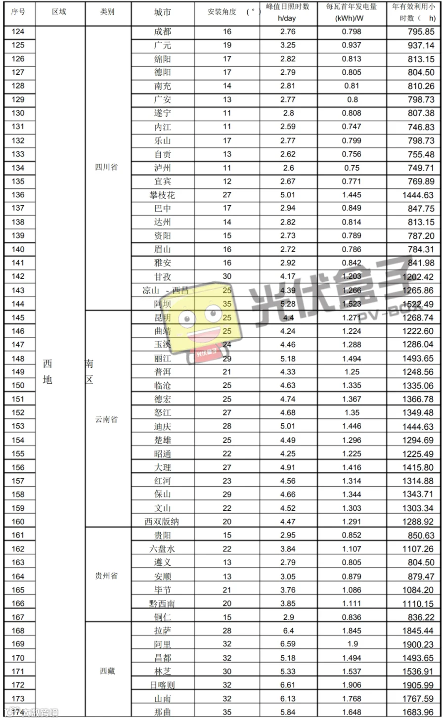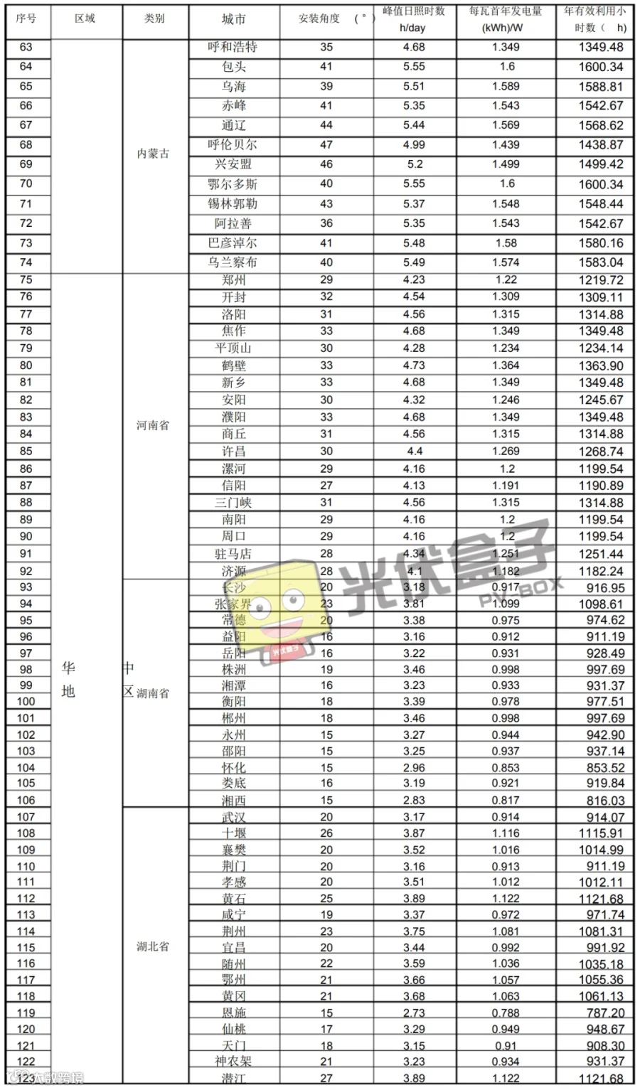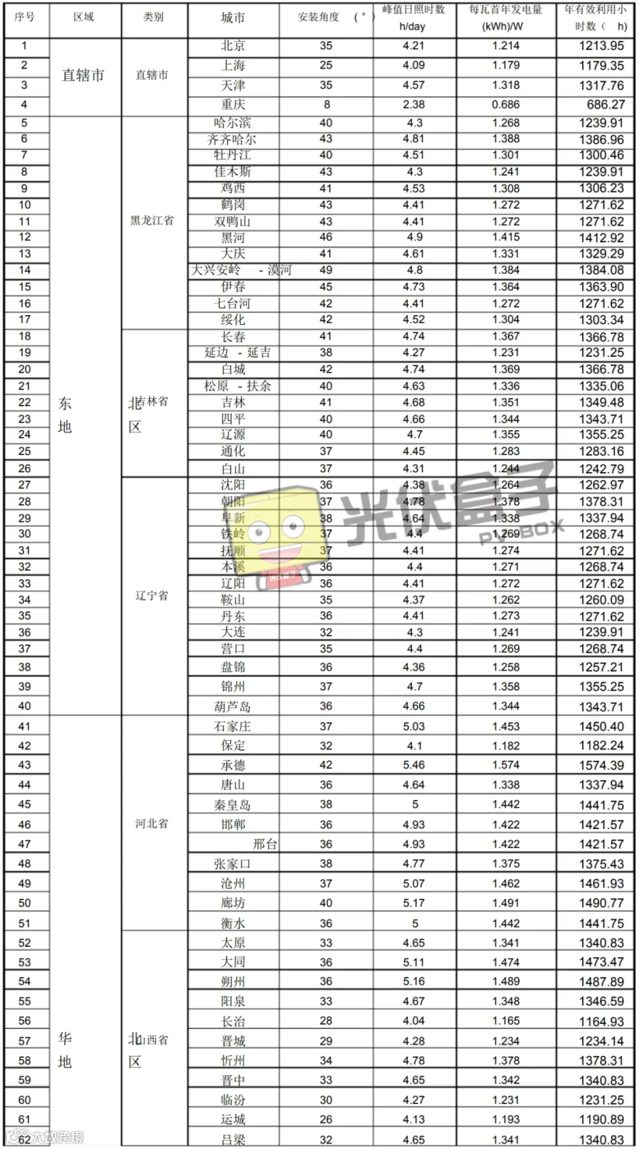 小编在此汇总了全国地面光伏电站最佳安装角度及发电量查询表,如下: