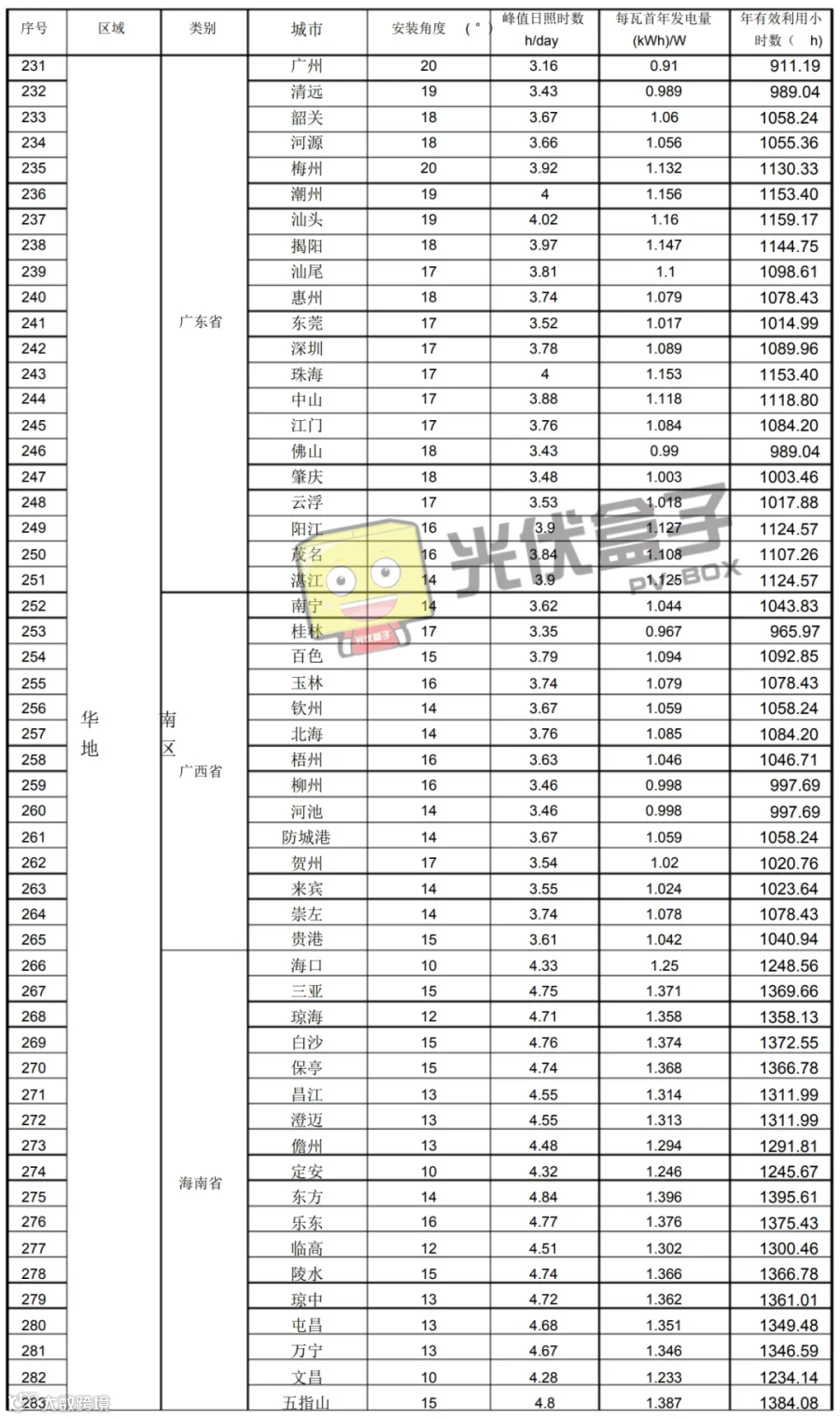 (2) 表中已根据当地经纬度换算出组件的最佳安装倾角