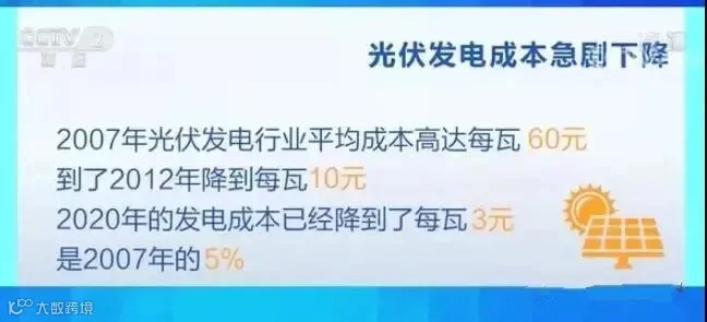 在浙江,一家企业的负责人告诉记者,他们公司的光伏发电成本,十年时间,下降幅度超过90%,这在相当程度上改变了光伏行业重资产投入的特性,减轻了企业的资本压力。记者走访北京、上海等多家光伏企业了解到,从我国光伏产业起步的2007年算起,当时,光伏发电行业平均成本高达每瓦60元,到了2012年降到每瓦10元,而今年的发电成本已经降到了每瓦3元,是2007年的5%。