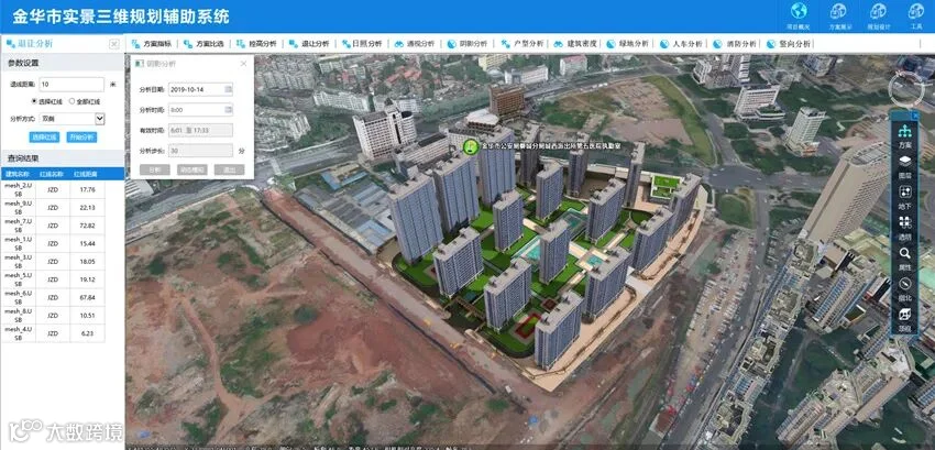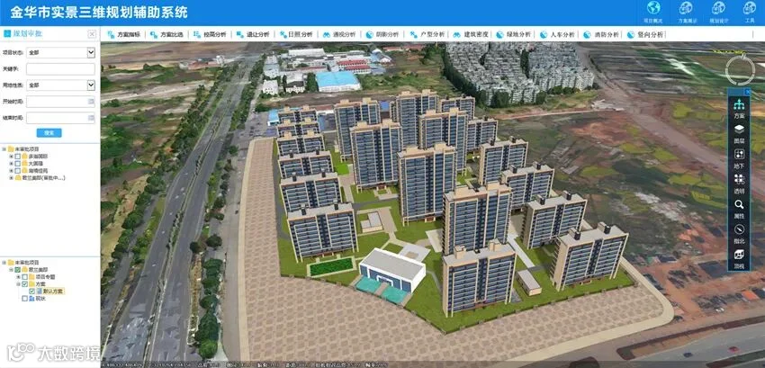 。同时,其可通过规划辅助模块的区位、总平图、控高、退让、建筑密度、人车路线和消防道路、日照阴影、实景环绕展示和分析等功能,辅助决策者决策。自2019年10月金华市实景三维规划辅助系统参与富力三江都荟苑项目的正式上会辅助之后,该系统现已参与31个项目和地块的三维规划辅助决策,其中正式评审上会项目23个。同时其还为兰溪市自然资源和规划局的宝龙广场、中医药文化研究中心、汽车城、北门农贸城等项目提供实景三维规划辅助技术支撑。该系统开始以金华为原点辐射周边,赋能规划辅助决策。