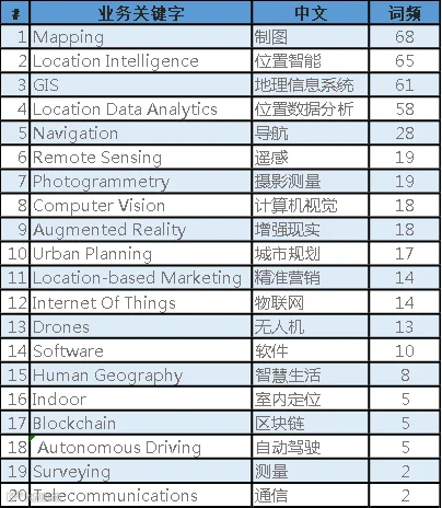 今年3月国外行业媒体Geoawesomeness通过网络调查投票评选出了全球Top100强地信企业(包括创业公司),作为行业的头部企业,其业务领域通常也比较前沿和具有代表性,这100强分布如下: