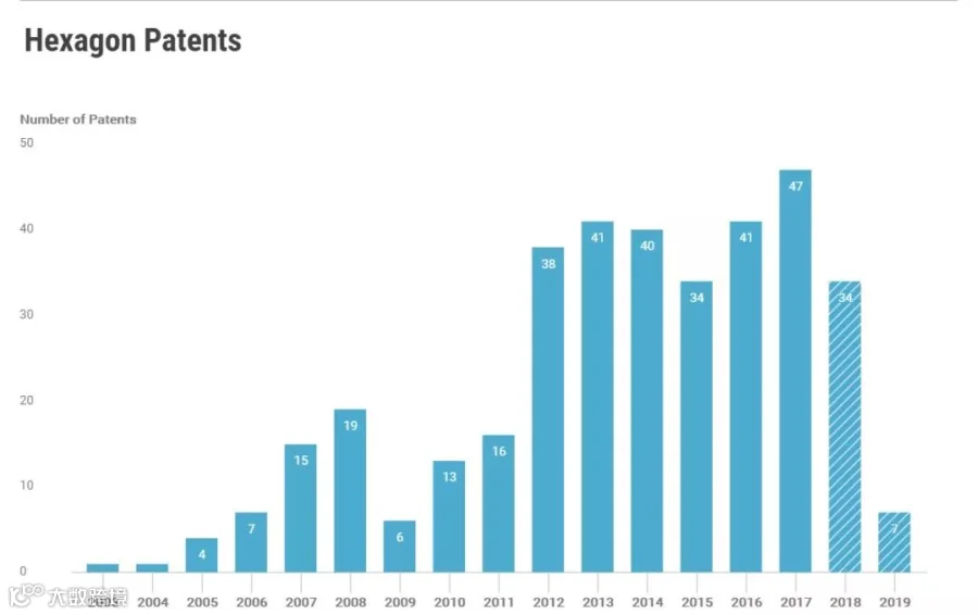 专利是企业技术积累和研发方向的风向标,截至目前,网上显示天宝公司有公开专利846项,海克斯康有专利364项,历年专利申请数量统计如下: