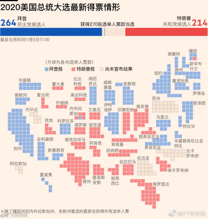 截至北京时间11月6日晚,选票仍为264:214,拜登只要再拿下6票,就能顺利当选。
