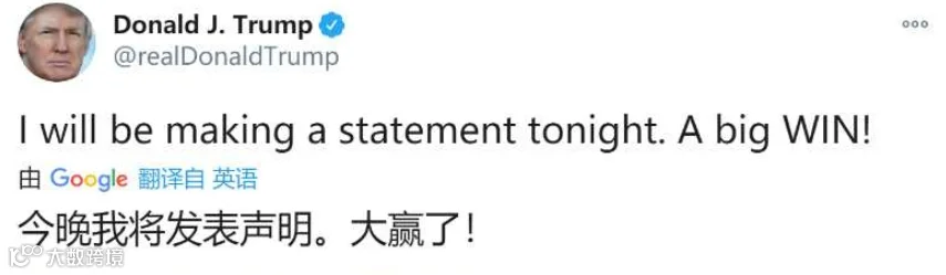 “我们正准备赢下这场选举,说实话,我们确实赢了。”“今晚我将发表声明。大赢了。”