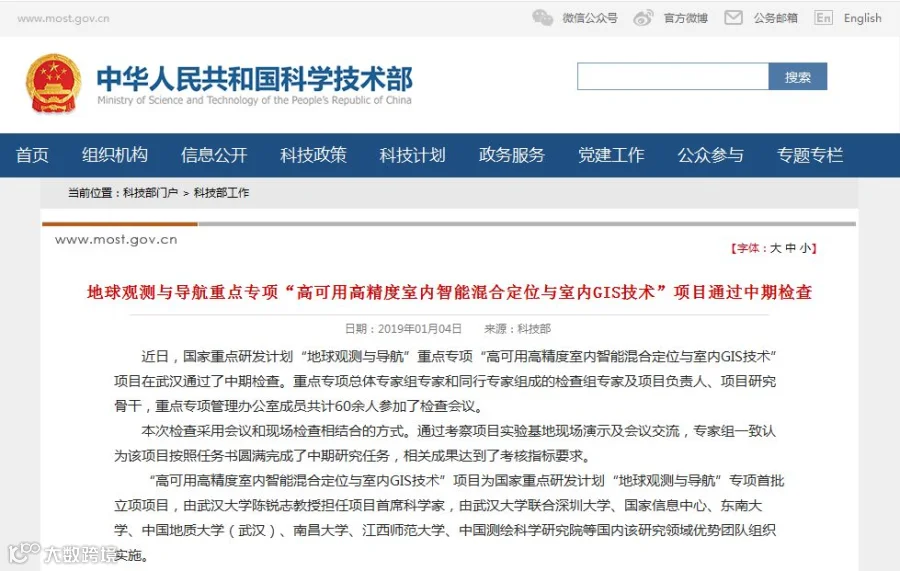 2019年1月4日,国家重点研发计划“地球观测与导航”重点专项“高可用高精度室内智能混合定位与室内GIS技术”项目在武汉顺利通过了中期检查。