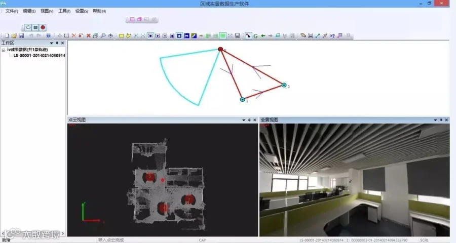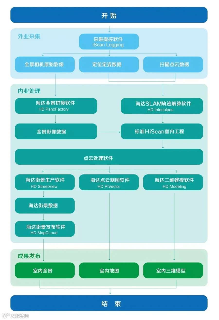 HiScan-SLAM室内移动测量系统包含外业采集、内业处理和成果发布几个步骤。利用操控软件完成外业采集,然后通过轨迹软件进行解算,得到HiScan标准工程数据,通过成熟完整的自主软件体系进行处理,得到室内全景、室内二维图和室内三维模型。