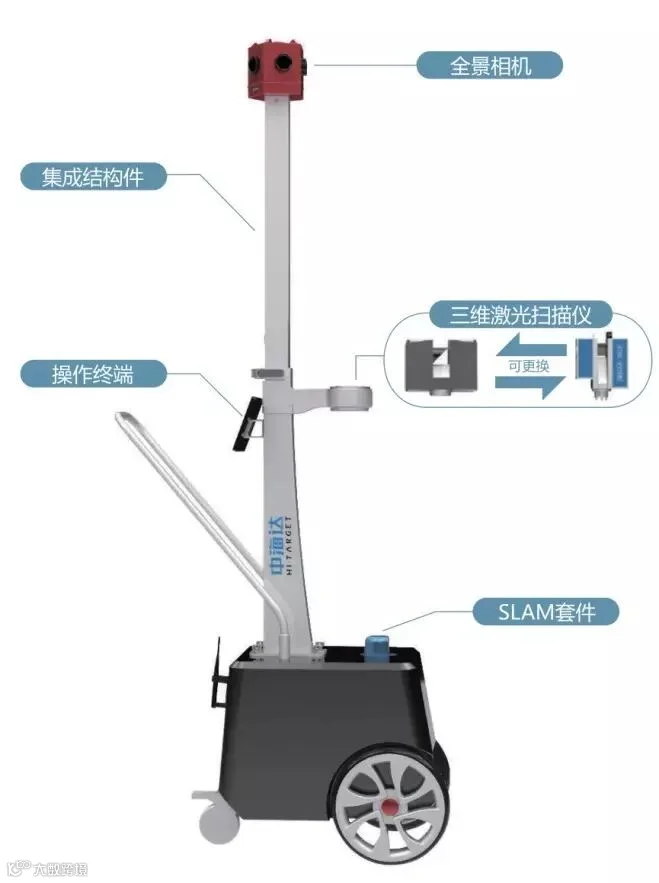 海达数云作为三维激光实景技术的生力军,借助其在移动测量系统领域的优势,突破基于激光的SLAM技术,将激光扫描仪、全景相机、里程编码器集成于一体,推出了HiScan-SLAM室内移动测量系统,应用于室内定位、室内空间信息获取与成图。