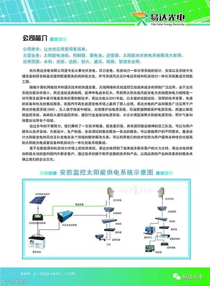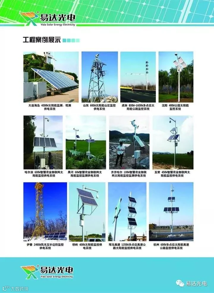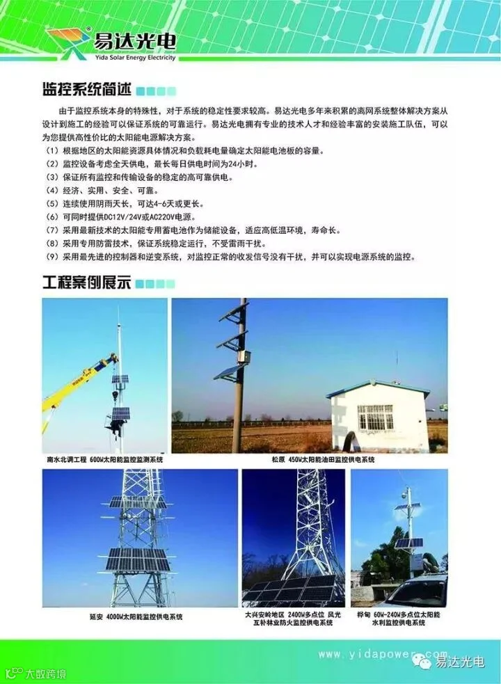 欢迎光临易达光电!本公司主营太阳能发电系统解决方案,可以根据客户的不同个性需求,规划设计,量身打造配置合理,性价比优异,各种功率的太阳能发电系统,广泛应用在野外养殖领域,林区牧区散住人群,监控监测领域,太阳能LED照明系统应用,更多详尽资料,请直接在线索取!