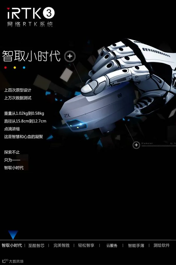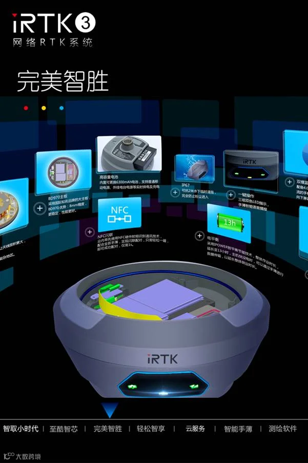 iRTK3网络RTK系统是中海达旗下一款超小型化GNSS RTK接收机,极致小巧的外观设计,镁合金结构。采用多星多频技术,内置全星座主板,智能实时内核平台更快更稳定、省电、流畅双模长距离蓝牙及NFC快速闪联,中海达云服务,带你进入互联网+时代。快捷、高效、放心的测量,为您带来至臻完美的用户体验。