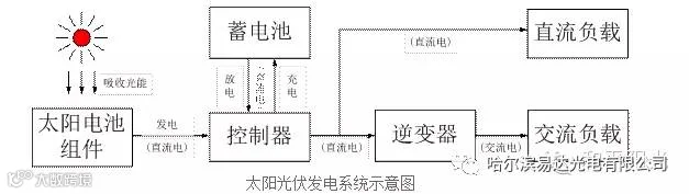 答:光伏发电系统由光伏方阵(光伏方阵由光伏组件串并联而成)、控制器、蓄电池组、直流/交流逆变器等部分组成。光伏发电系统的核心部件是光伏组件,而光伏组件又是由光伏电池串、并联并封装而成,它将太阳的光能直接转化为电能。光伏组件产生的电为直流电,我们可以直接利用,也可以用逆变器将其转换成为交流电后使用。从另一个角度来看,光伏发电系统产生的电能可以即发即用,也可以用蓄电池等储能装置将电能存放起来,根据需要随时释放出来使用,其系统组成如下图所示: