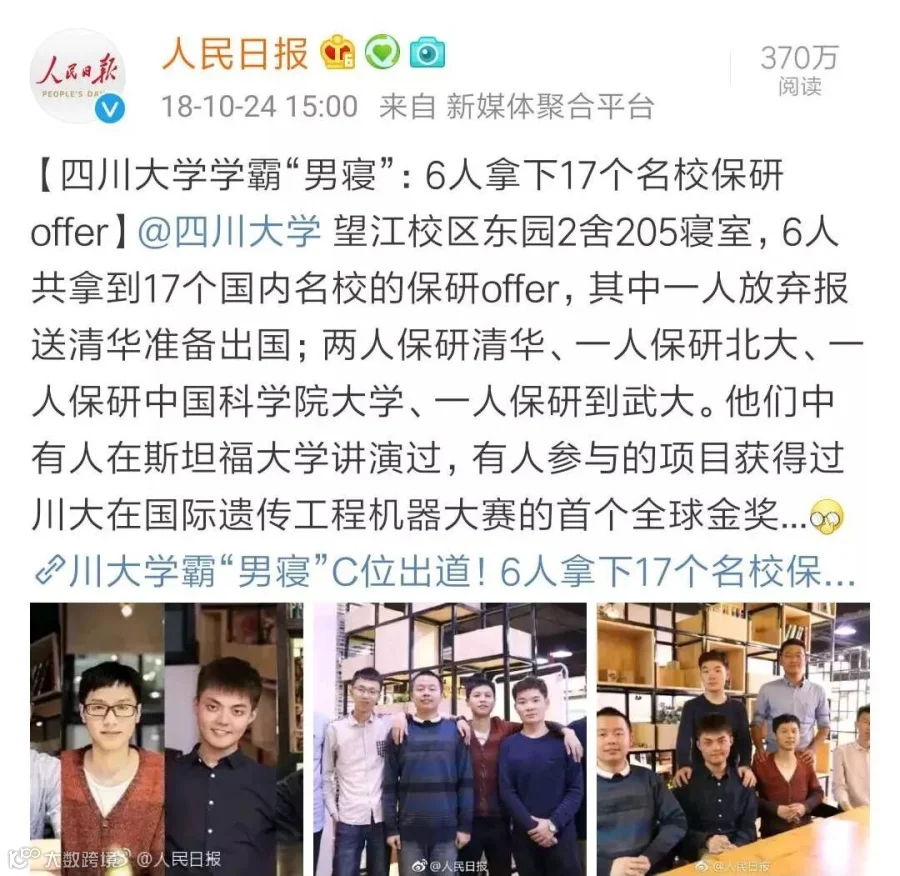 去年,四川大学一个男生宿舍上了微博热搜:6个男生,共拿到17个保研offer。