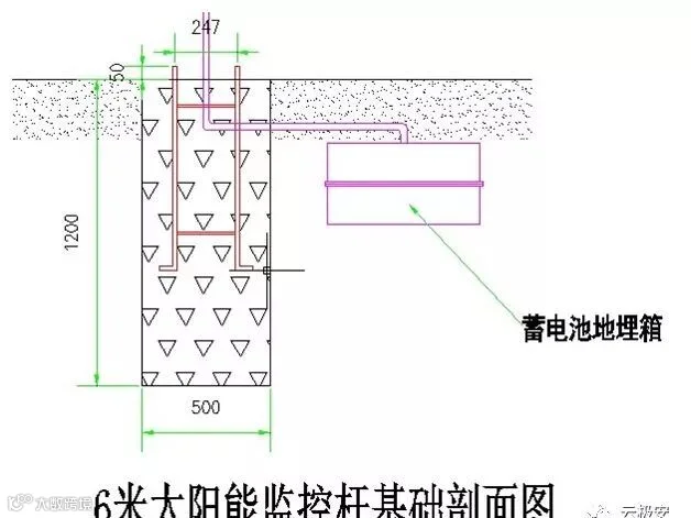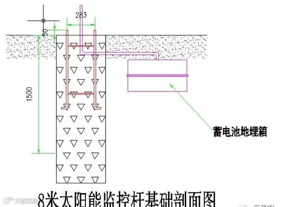 地基是用来固定太阳能监控杆的结构,同时它也起到放置和保护蓄电池的作用。