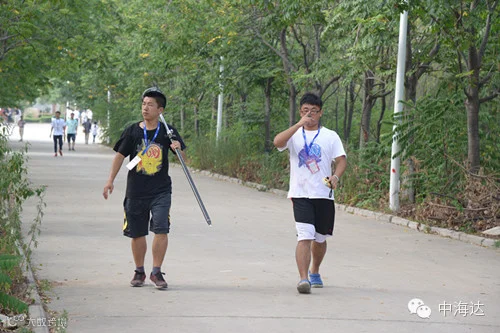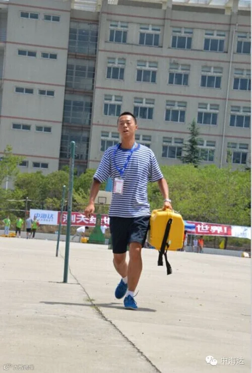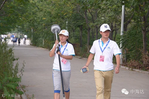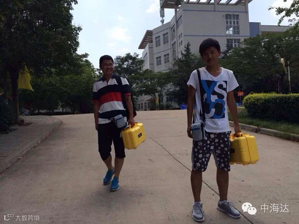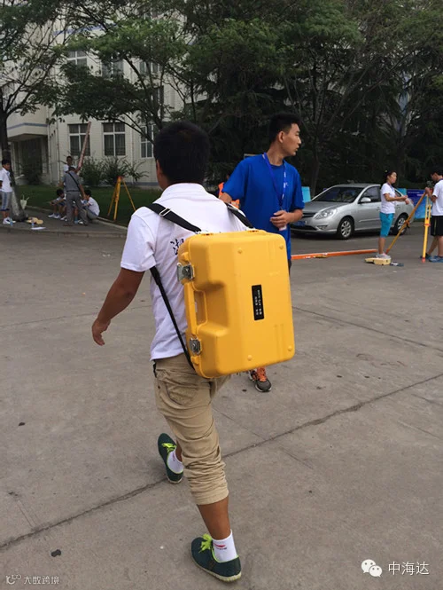 两名参赛选手,背着中海达包,提着仪器前往比赛场地