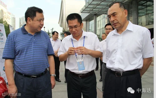 中海达常务副总裁徐峰(中)为库热西局长(右)、湖北省副省长许克振讲解iScan