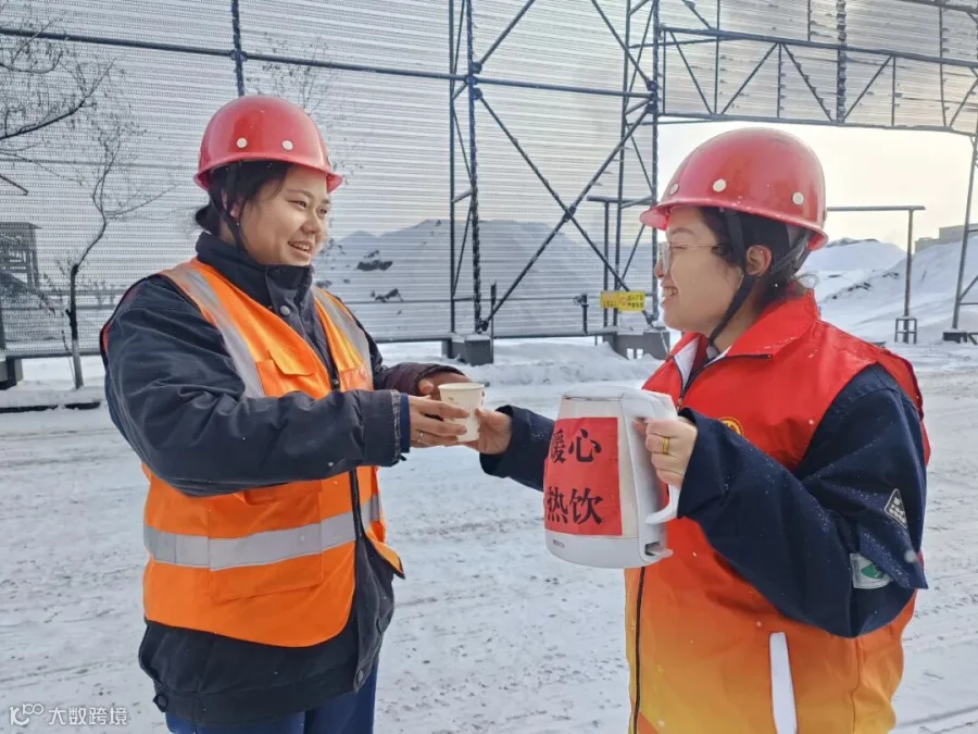 12月18日,众泰煤焦化60万吨/年焦化焦场,原料一车间青年志愿者张调梅正将一杯杯热姜茶送到岗位职工手中。