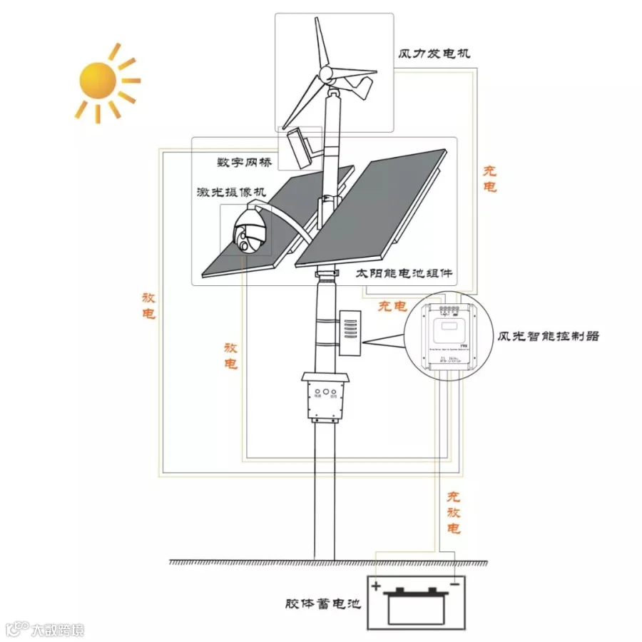 太阳能供电子系统是由太阳能组件、风力发电机、胶体蓄电池、智能充放电控制器等组成,太阳能组件和风力发电机将光能转变为电能,经由一台风光互补智能控制器的控制,把电能存储到蓄电池(充电);需要供电时,打开控制器开关接通负载,把蓄电池中的电能提供给负载(放电)。智能控制器的主要作用是对蓄电池进行充放电管理,当在工作时间内蓄电池供电不足时,控制器自动切断负载供电,对蓄电池进行过放保护;当蓄电池持续充电时,控制器对蓄电池进行过充保护。
