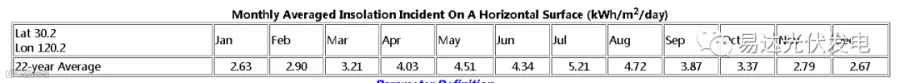 本系统安装了40块280Wp的高效组件,装机容量共11.2kW,系统效率=82%,从NASA上导出的光照数据如下表, 项目安装地浙江杭州地区全年日平均有效发电日照时数为2.67*365=974.55小时。