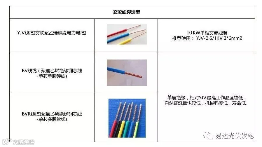 交流线缆用于逆变器交流侧至交流汇流箱或交流并网柜,可以选用YJV型号线缆。 长距离铺设还需考虑到电压损失和载流量大小, 10kW三相机交流线缆推荐使用YJV-4*6mm2。