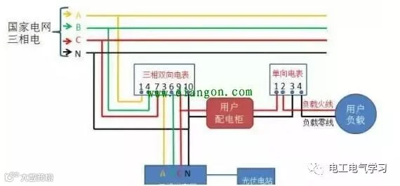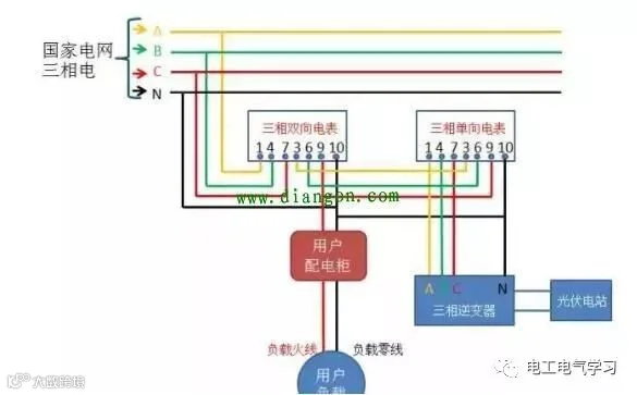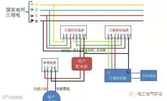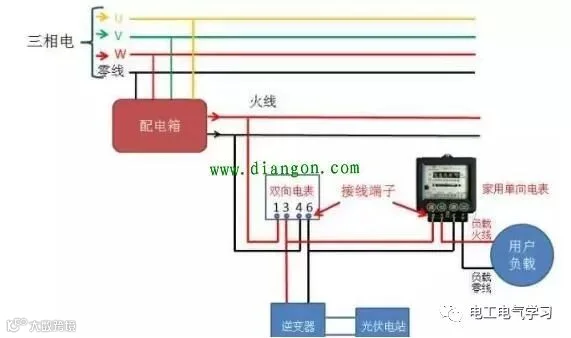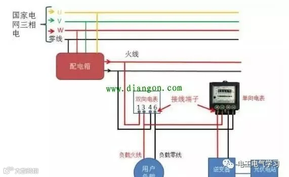 通过上方的双向电表结构图,可以很清楚的看到,市电的火线接双向端子1,零线接双向电表的端子4,双向电表的出线端子接单向电表端子1,出线6接端子3,负载端接单向电表2,4端子。要实现自发自用、余电上网,要在用户侧加入一个用户家庭电表,用于计量光伏电站的发电总量,具体接线方式参考下方示意图。