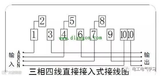 三相电表的1,4,7端子是A,B,C三相进线,3,6,9是A,B,C三相出线。10号端子接零线N.