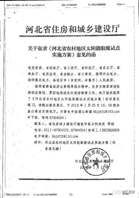 2018年1月12日,河北住建厅下发《河北省农村地区太阳能取暖试点实施方案》(征求意见稿),提出: