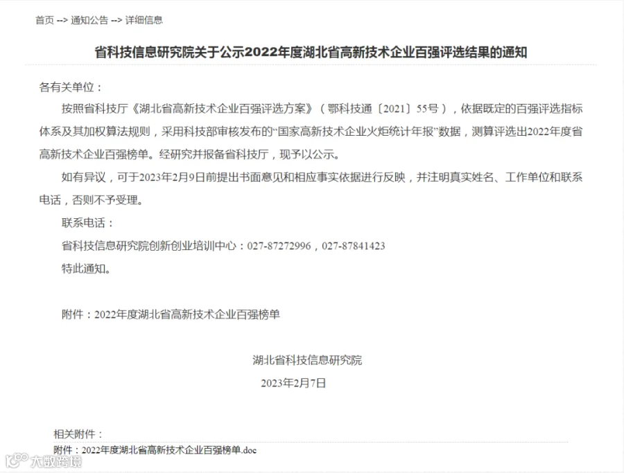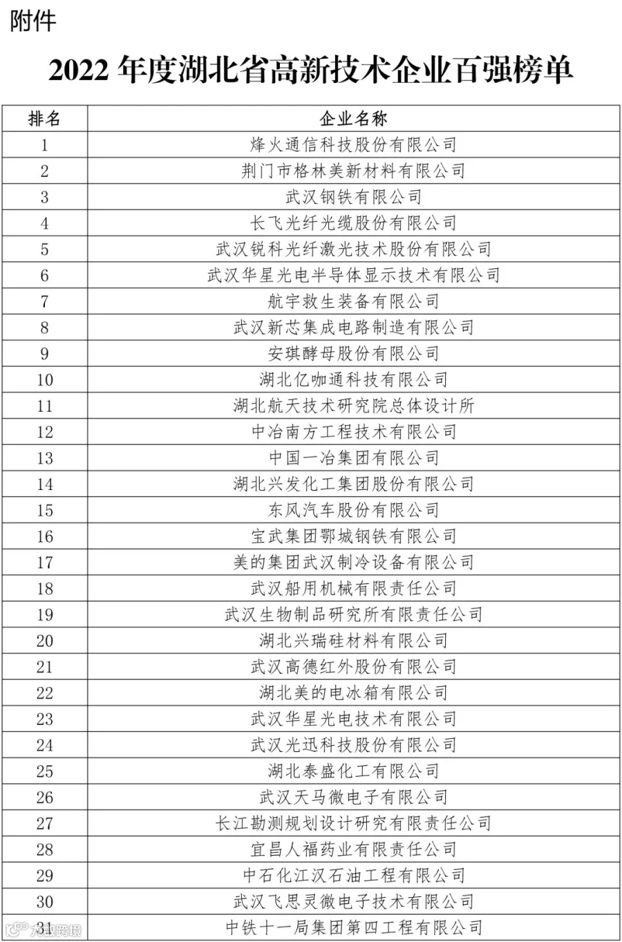 近日,省科技厅发布《湖北省高新技术企业百强榜单》依据既定的百强评选指标体系及其加权算法规则,公司荣登2022年度省高新技术企业百强榜单。