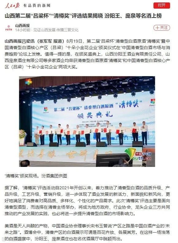19日下午,第二届“吕梁杯”清香型原酒“清樽奖”颁奖盛典隆重举行!庞泉酒庄荣获清香型白酒原酒“清樽奖”和中国清香型白酒核心产区(吕梁)“十朵小金花企业”两项大奖!