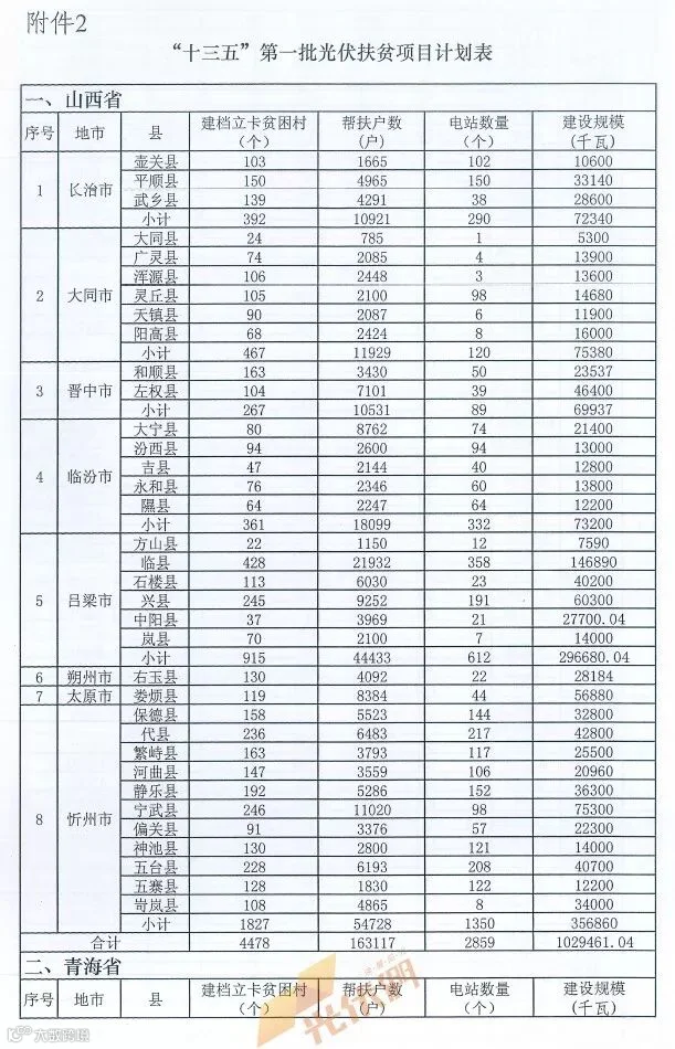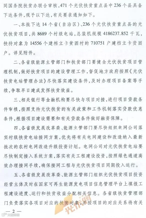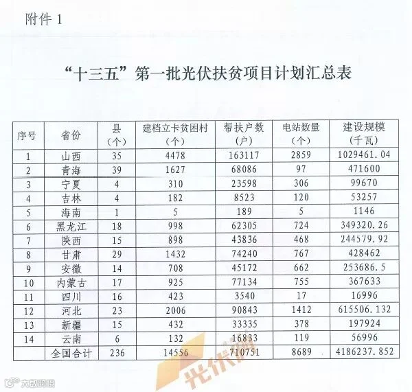 近日国家能源局、国务院扶贫开发领导小组办公室联合发布《关于下达“十三五”第一批光伏扶贫项目计划的通知》,经过国家能源局、国务院扶贫办及相关单位数月的辛苦审核,涉及14个省(自治区)、236个光伏扶贫重点县的总规模4186.237852MW的光伏扶贫项目获得批准,面向的扶贫对象为14556个建档立卡贫困村的71.0751万户建档立卡贫困户。